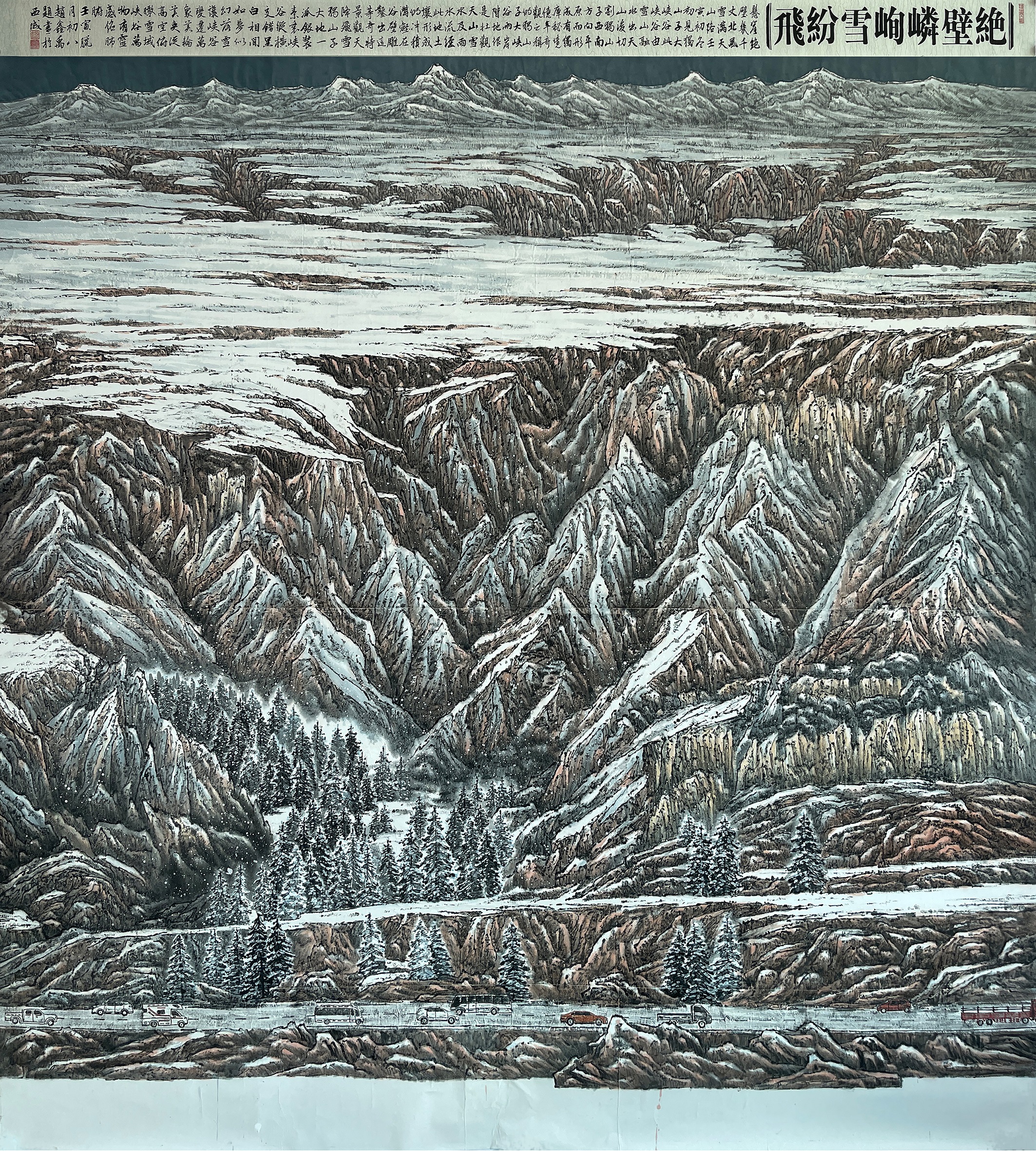 《绝壁嶙峋雪纷飞》中国画 180cmx200cm