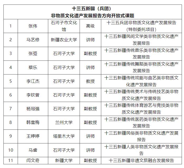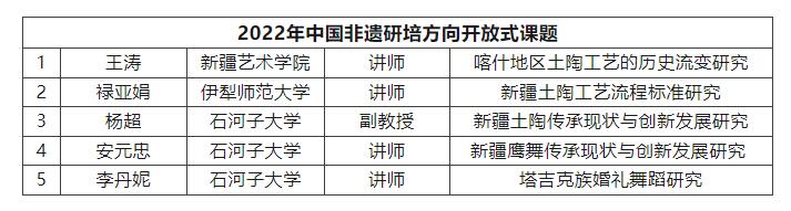 2022年度自治区高等学校人文社科重点研究基地·新疆非物质文化遗产研究中心开放式课题申报通知发布后,我们共收到33项申报书(含特别委托项目),这让我们倍感荣幸和鼓舞。我们特别感谢所有申报学者对新疆非物质文化遗产研究与保护事业的关注,感谢来自疆内外不同高校的各位同仁对石河子大学新疆非物质文化遗产研究中心的鼎力支持。经过专家们的认真评审,我们拟立项16项开放式课题,下面将立项名单公示如下: