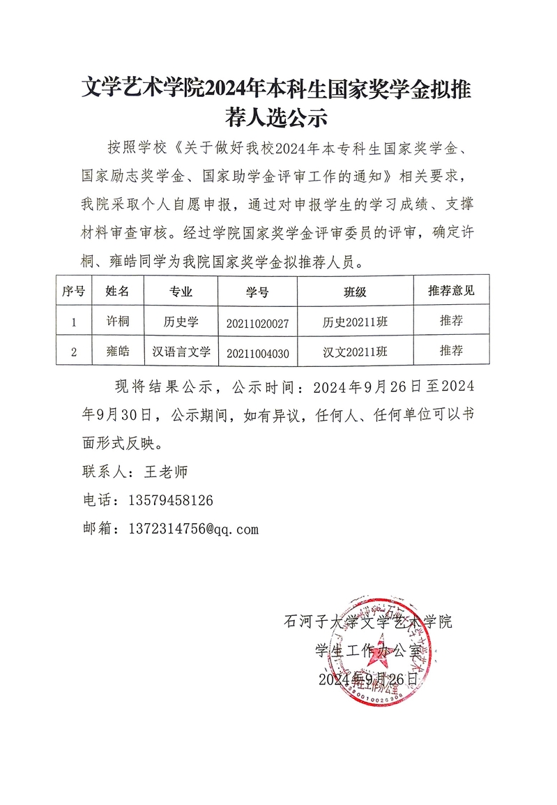 按照学校《关于做好我校2024年本专科生国家奖学金、国家励志奖学金、国家助学金评审工作的通知》相关要求,看球网 采取个人自愿申报,通过对申报学生的学习成绩、支撑材料审查审核。经过看球网国家奖学金评审委员的评审,确定许桐、雍皓同学为看球网 国家奖学金拟推荐人员。