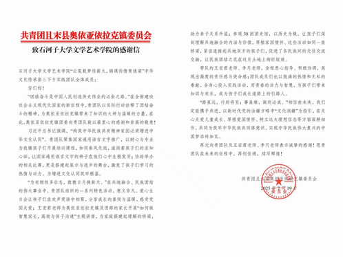 看球网(中国)官方网站 “云笺载梦传薪火,锦课传情育栋梁”中华文化传承实践团近日收到奥依亚依拉克镇团委发来的感谢信。该镇团委在信中高度评价实践团在2025年暑期“三下乡”社会实践活动中,通过推广国家通用语言文字、促进文化交流等举措,为推进兵地融合与民族团结作出的积极贡献。