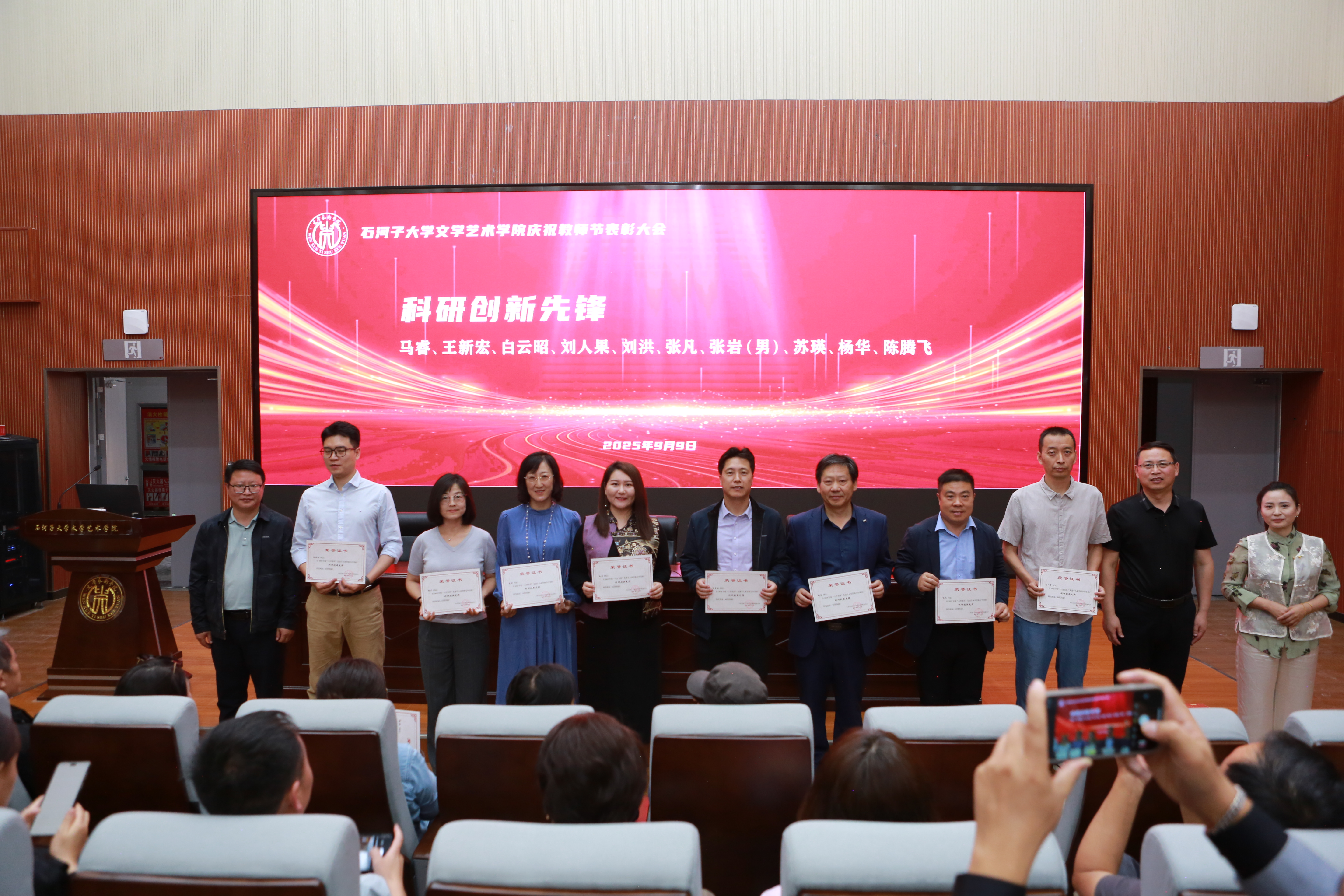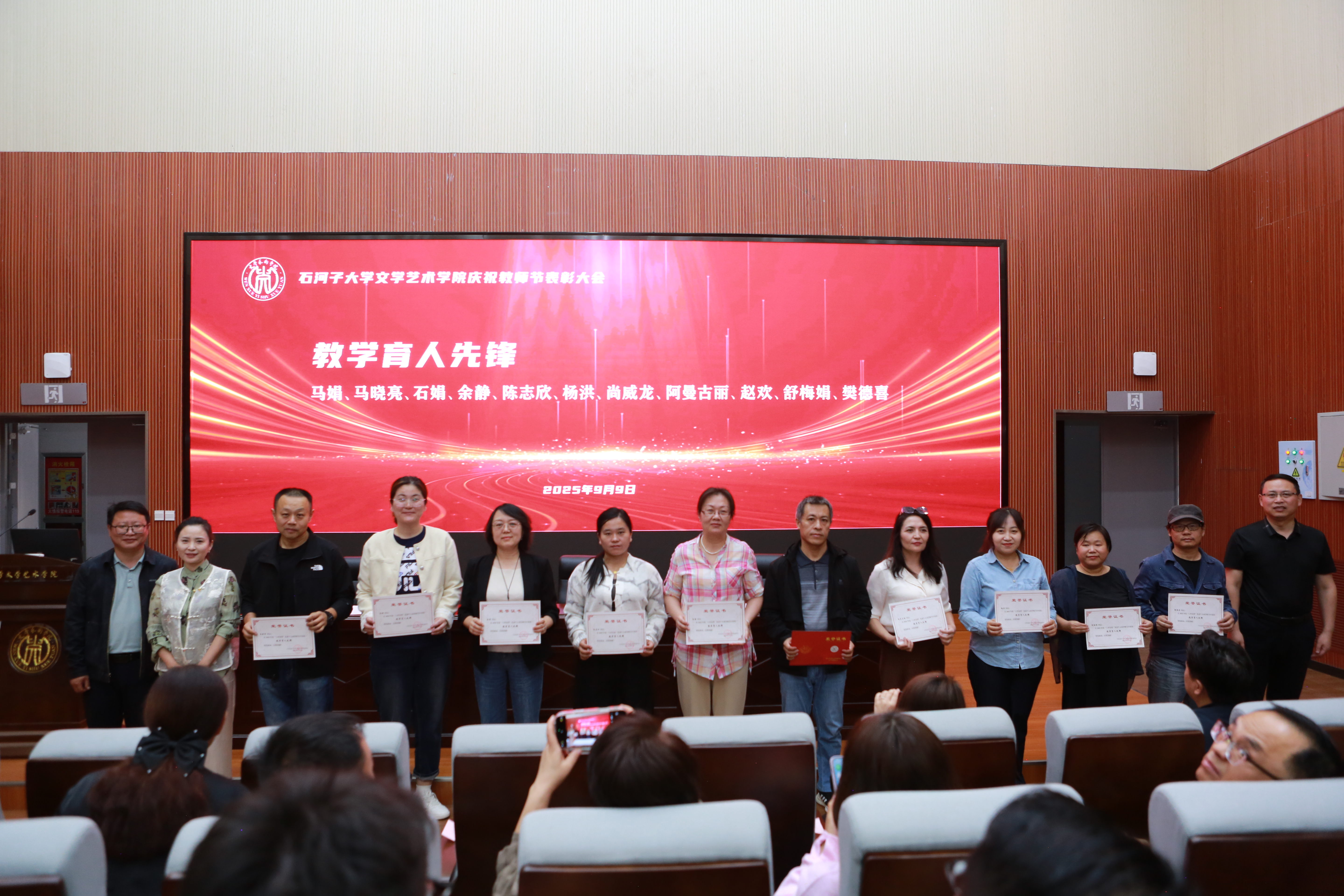 杨向奎院长、胡新华副院长、杜瑶副院长依次为获奖教师颁发荣誉证书,并与他们合影留念。每一位上台领奖的教师,都收获了全场热烈的掌声与敬意,这一庄重时刻成为他们职业生涯中难忘的高光瞬间。