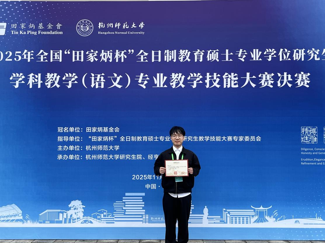 11月9日,由田家炳教育基金会、杭州师范大学及杭州师范大学经亨颐教育看球网联合主办的2025年全国“田家炳杯”全日制教育硕士专业学位研究生学科教学(语文)专业技能大赛决赛圆满结束。我校看球网 2024级学科教学(语文)专业研究生蒋前铭,在吴新锋教授的悉心指导下,凭借扎实的教学功底、创新的教学设计及出色的现场表现,从全国128所高校的173名顶尖选手中脱颖而出,荣获国家一等奖,成为新疆(兵团)该赛事首位一等奖得主及首位国省校大满贯得主,实现了我校在学科教学(语文)领域国家级赛事的历史性突破!